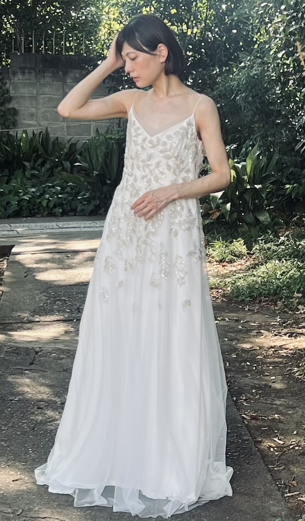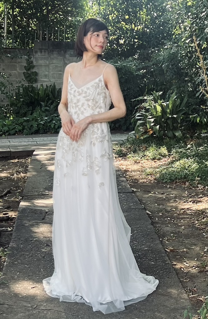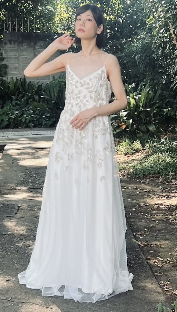 リーフモチーフのビーズ刺繍のチュールレース 胸元のカッティングが美しいキャミソールタイプのウエディングドレス 人気の華奢なスパゲッティストラップ 胸元の開き具合はレンタルでも調整可能です。 スカート部分のビジューは手縫いしており、繊細な雰囲気のドレスになっています。 こちらは、カラーバージョンもオーダーレンタルやセミオーダーなどで可能になります。
