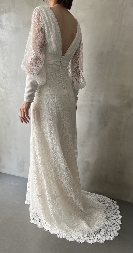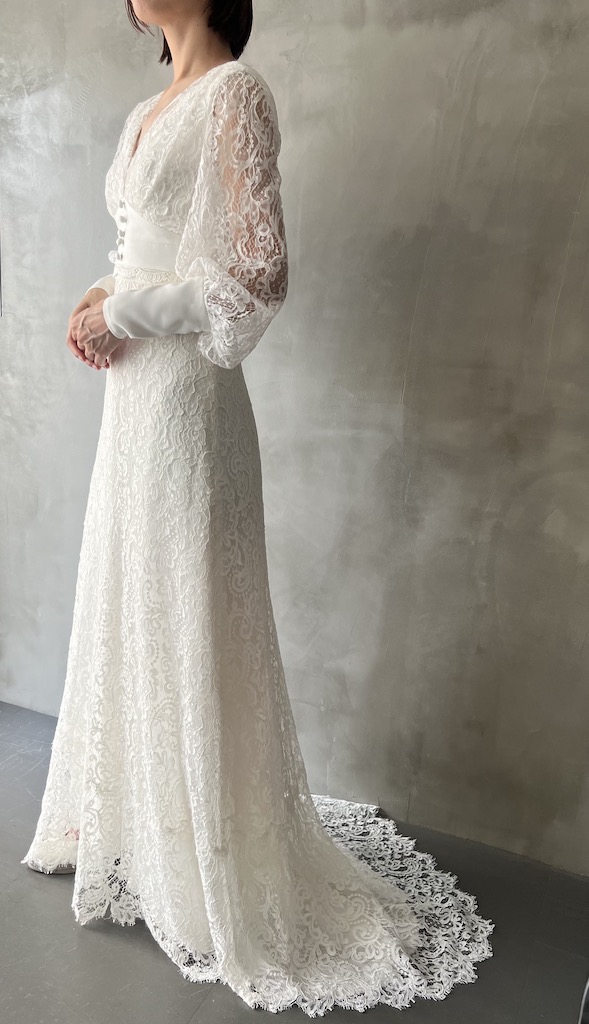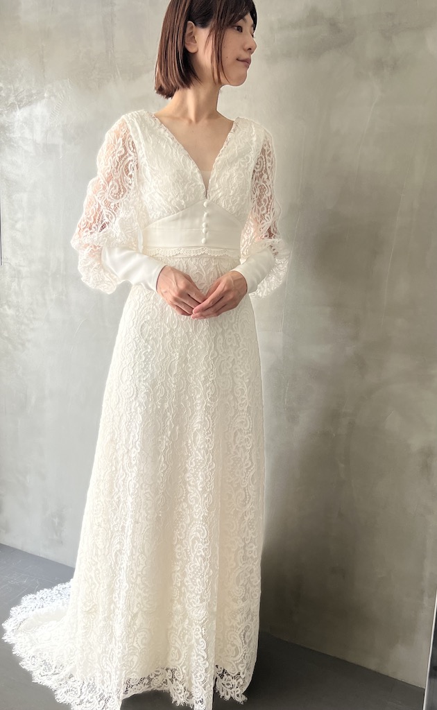 コードレースパフスリーブ長袖ウエディングドレス 前面に上質なコードレースを使用し、長めのカフス部分とウエスト部分の生地は上質なシルクトリプルジョーゼットを使用 カフスとバックスタイルはクルミボタンでクラシカルな雰囲気になっております。 袖部分が少しボリュームもあり、胸元の開きや背中部分は深めに開いていますが、上品な仕上がりになっております こちらはサイズによって、レースの種類が変わります。 オーダーレンタルやセミオーダーご希望の方は、レースをお選びできます。 レースにより価格が変動します。